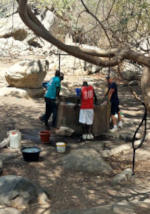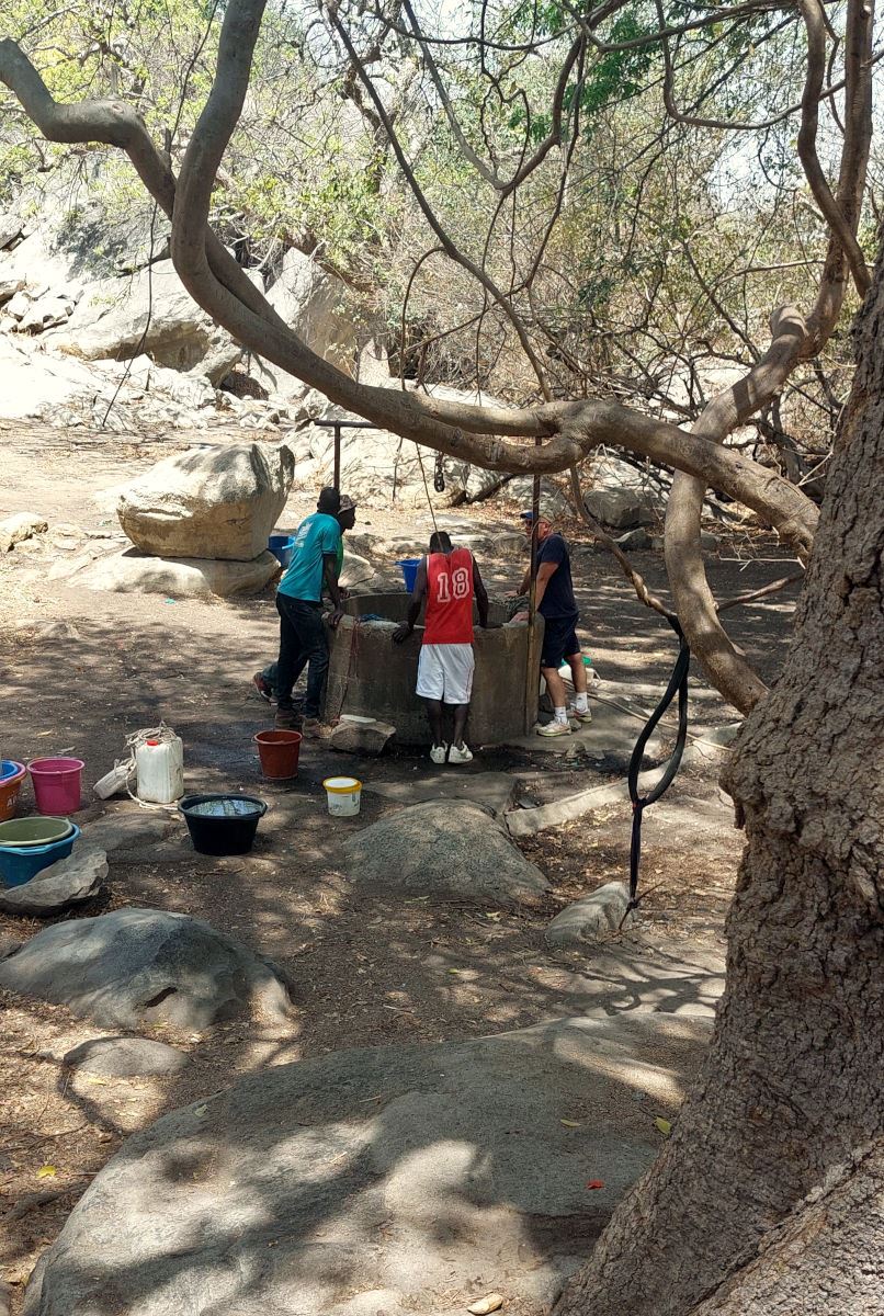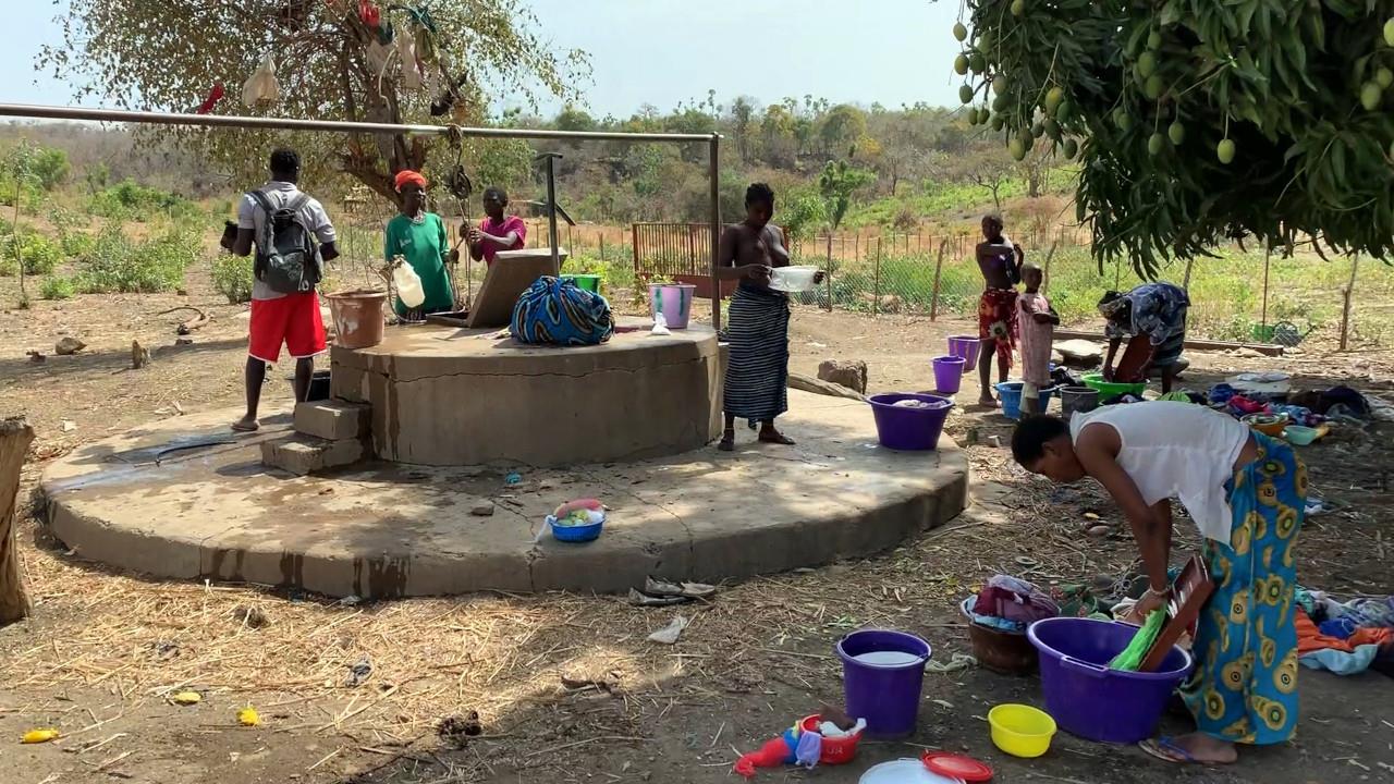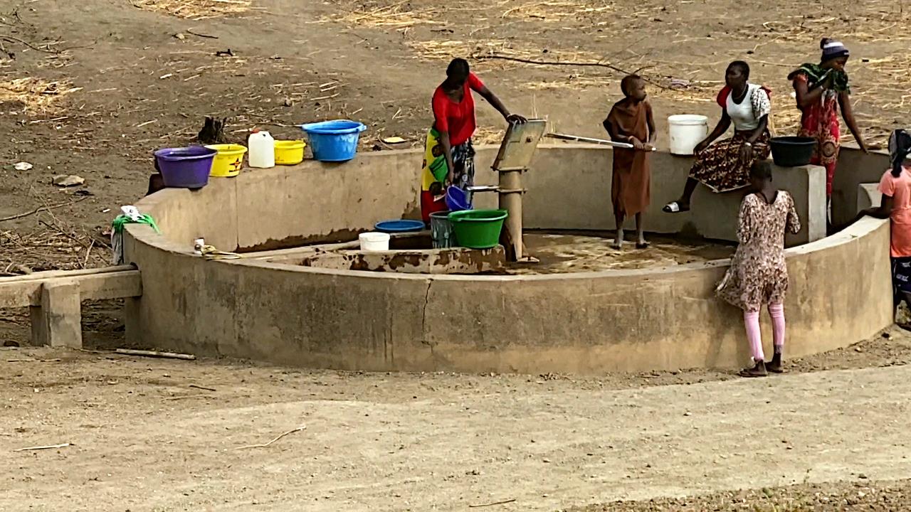 Au bas de la colline, dans la plaine, il y a un forage et un puits. Les villageois s'y rendent plusieurs fois par jour.