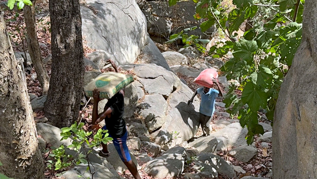 Les enfants, les jeunes, les femmes, les hommes montent les parpaings, le ciment et toute la marchandise utile à la fabrication de l'école !